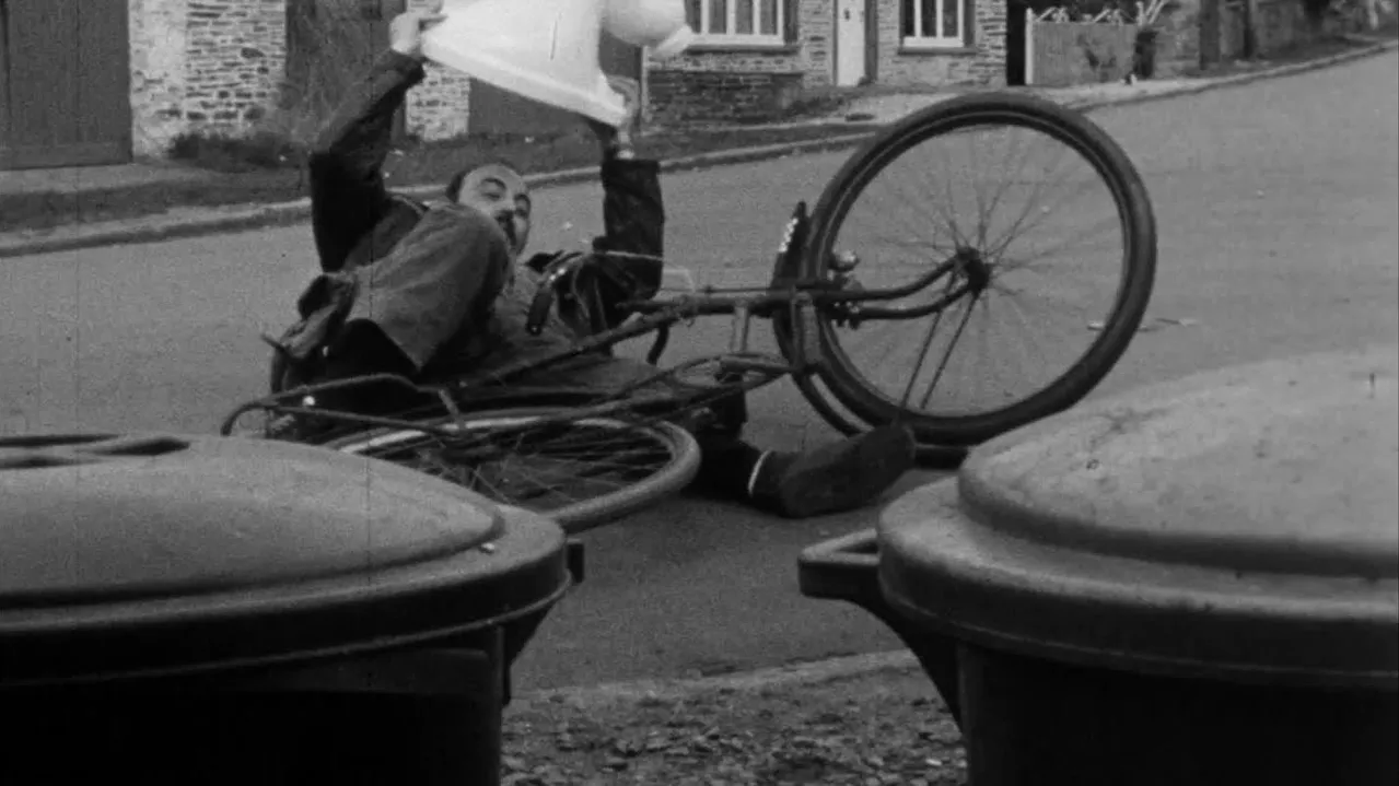 A plumber stops to have a drink and when he returns to his bike he finds it minus the front wheel. He tries to retrieve it ... .